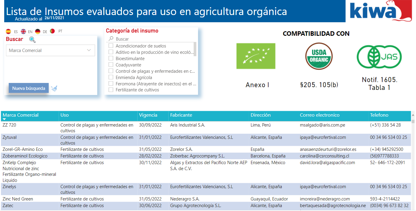 En la actualidad, utilizando el programa de Power BI, se ha podido sintetizar toda la información de insumos que Kiwa a nivel global posee, con la finalidad de que los productores, consultores, organizaciones y empresas puedan consultar información actualizada de una fuente confiable, con la finalidad de conocer si un insumo cumple con la normativa orgánica internacional. Kiwa se ha enfocado en mejorar la interacción y entendimiento de los usuarios al buscar información específica sobre dicho programa de evaluación.
