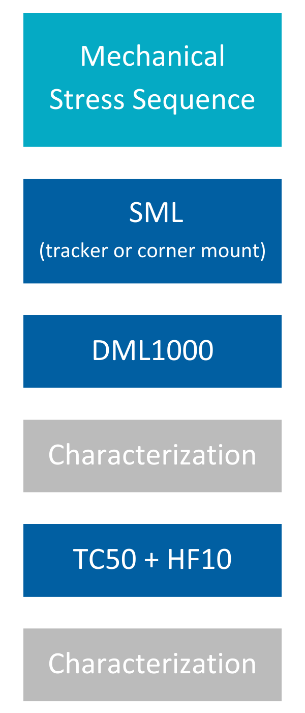 MSS is comprised of four tests in sequence: static mechanical load (SML), dynamic mechanical load (DML), thermal cycling, and humidity freeze. The mechanical loading steps create and propagate cracks in susceptible modules, and then power loss is induced through the environmental stress of thermal cycling and humidity freeze.