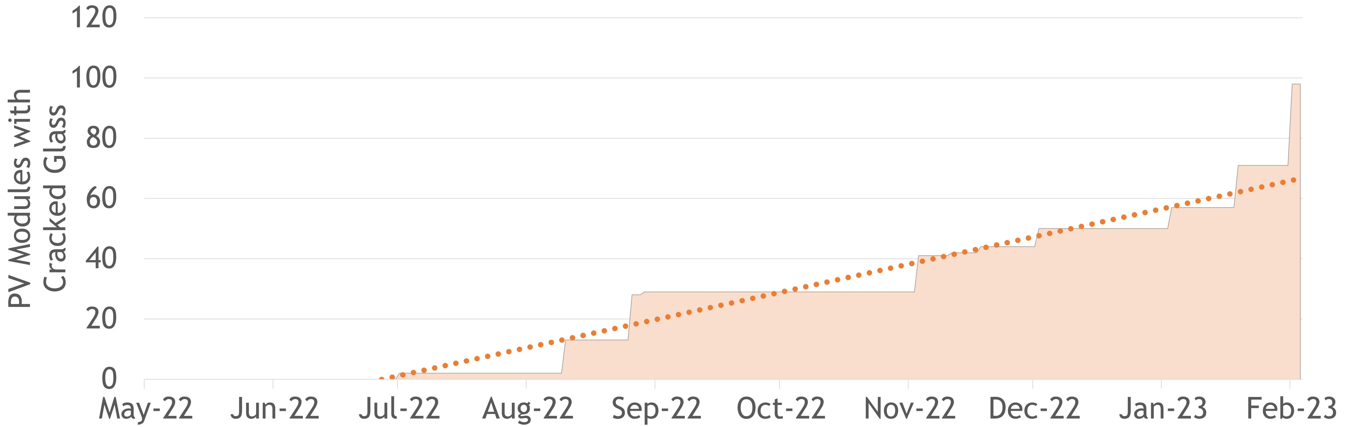 Number of PV modules with cracked glass. The trend line represents ~14 cracked modules per month.