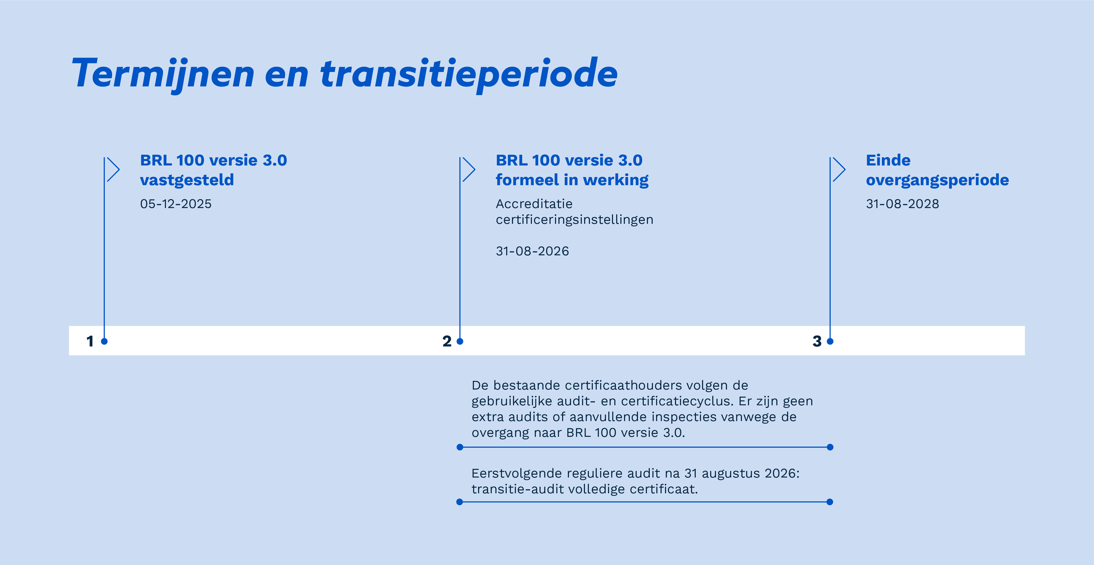 Wanneer de eerstvolgende reguliere audit plaatsvindt na 31 augustus 2026, wordt deze uitgevoerd als transitie-audit. Tijdens deze audit wordt beoordeeld of processen en uitvoering voldoen aan BRL 100 versie 3.0. Een onderneming met een geldig BRL 100 versie 2.0-certificaat die een uitbreiding aanvraagt voor een nieuw deelgebied 2 of 3, doorloopt een transitie-audit voor het volledige certificaat. Daarbij worden zowel deelgebied 1 als het nieuwe deelgebied beoordeeld volgens BRL 100 versie 3.0. Na positieve afronding wordt een volledig BRL 100 versie 3.0-certificaat uitgegeven.