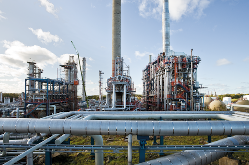 Industriell anläggning med rörledningar, skorstenar och byggnader under en blå himmel.